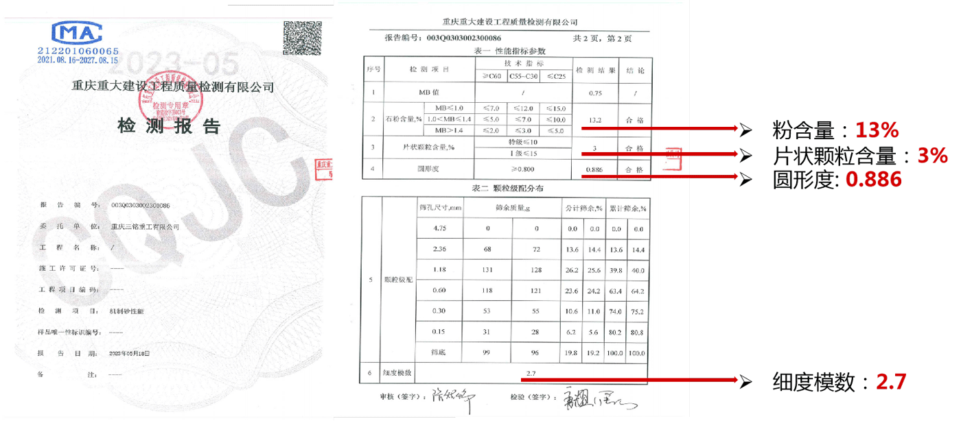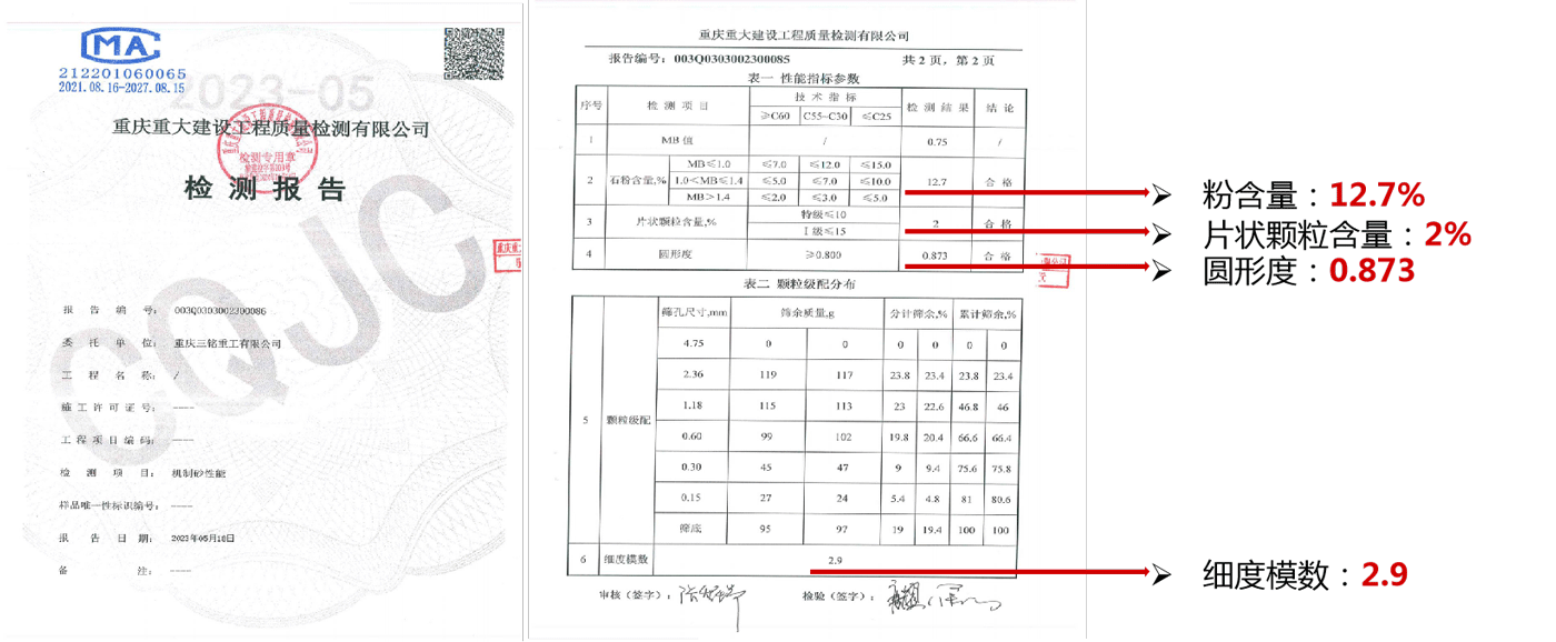 三方機構(gòu)檢測報告2:符合國標(biāo)《GB-T14684-2022 建設(shè)用砂》中砂Ⅱ區(qū)標(biāo)準(zhǔn)
